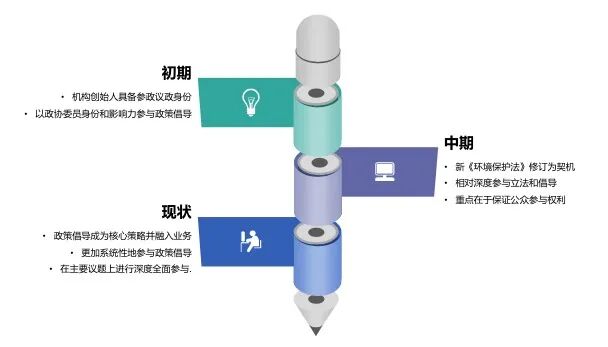 初期参与政策倡导的特点是创始人具备参政议政身份,梁从诫先生以政协委员的身份和影响力参与政策倡导,在全国政协新闻网上可以看到梁先生作为全国政协委员所参与的环境保护相关的议案提案。