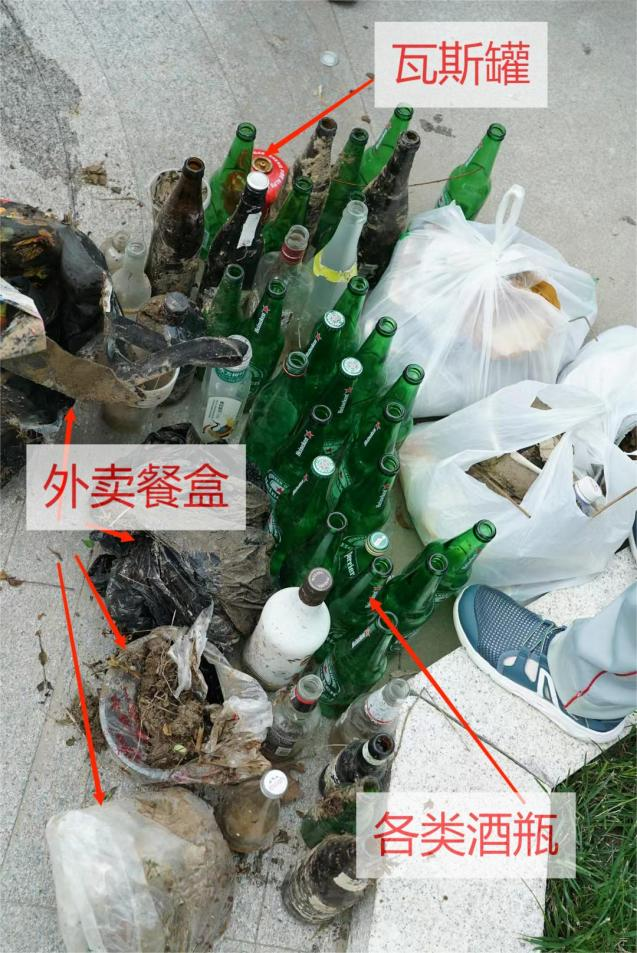 ▲在矮灌木丛的洞里,发现了“宝藏”——近40个玻璃酒瓶,3大包外卖餐盒甚至还有一个废弃瓦斯罐