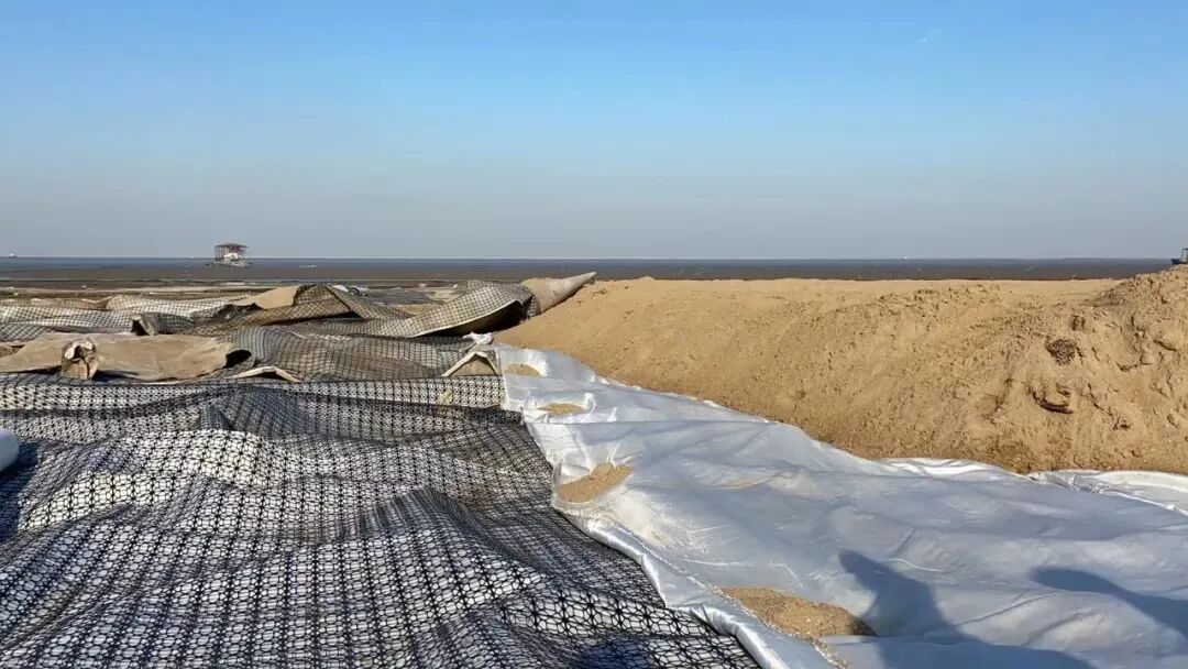 ▲工程近岸处已开始铺设约1米高的沙滩,自然滩涂已经被填埋。2021年12月18日拍摄