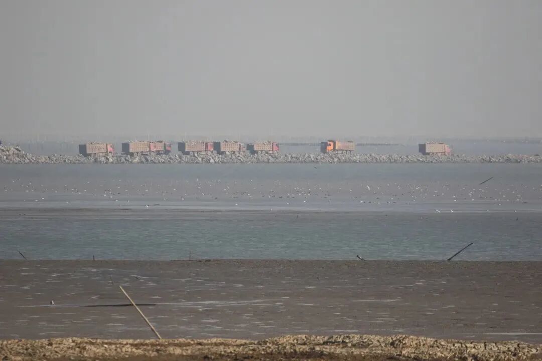▲十余辆载满石块的卡车在环抱堤上行驶作业,这些石块将用于堆高环抱堤。画面中央密密麻麻的白点和黑点是在环抱堤内觅食的鸟群。工程结束后,环抱堤内将存蓄4米高的深水,目前残存的鸟类觅食地将不复存在。2021年12月19日拍摄