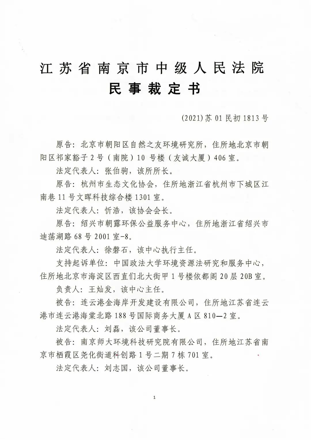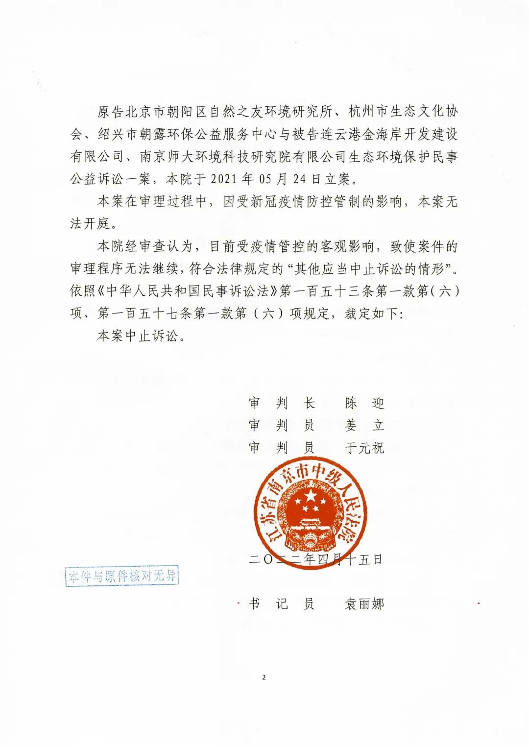 4月27日,自然之友收到南京市中级人民法院关于中止审理连云港滨海湿地公益诉讼案的民事裁定书。法院裁定案件中止审理的原因是:“本案在审理过程中,因受新冠疫情防控管制的影响,本案无法开庭”。