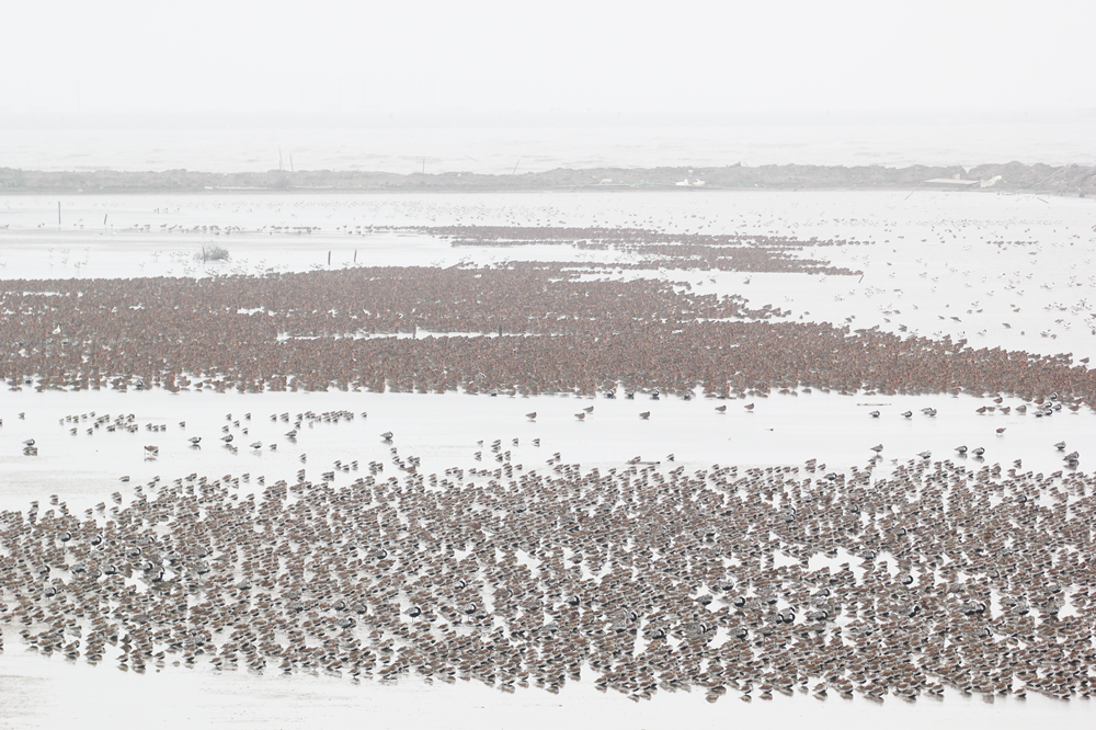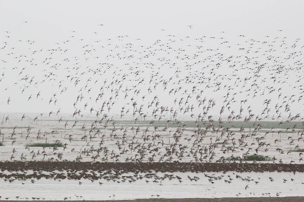 ▲种类和数量众多的水鸟在临洪河口滩涂觅食