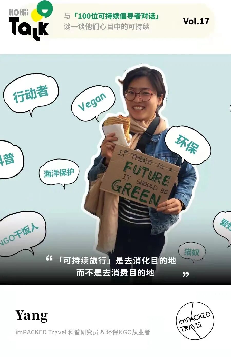 不过,Dani还是希望能给自己信心,也给别人信心。在很久以前,Dani写过这样一句话:“我们是通过了自我认证的可持续旅行倡导者”。她说这句话其实是调侃,想要打破大家所认知的自上而下的认可,“我们觉得我们不是专家,但是我们确实每天都在研究,所以肯定是会比没有在研究的人懂那么一点点。你要用有理有据的科学的方式去说这个事情,并且也给大家一些解决的方案,我觉得这样的话,你就是自我认证,你不需要别人去给你一个title(头衔),你也可以是站出来说话的”。