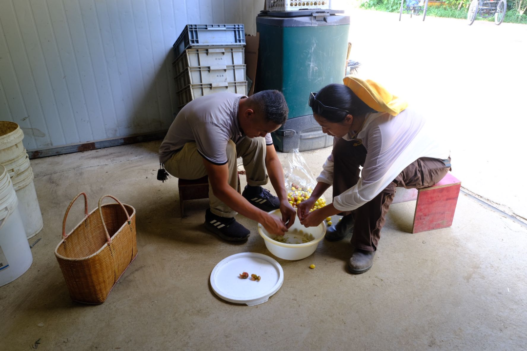 沈叶在悦丰岛有机农场和技术员阿汤哥一起筛选番茄种子