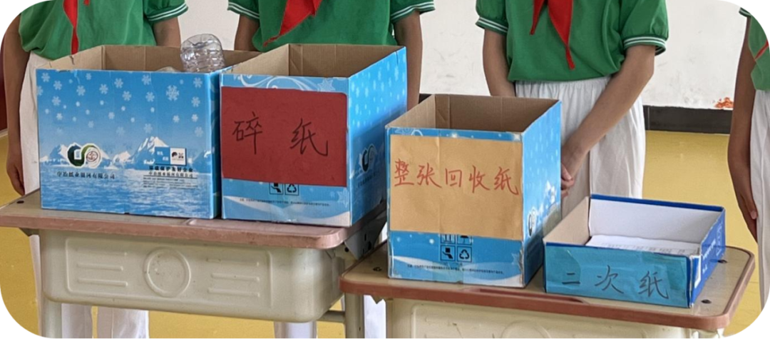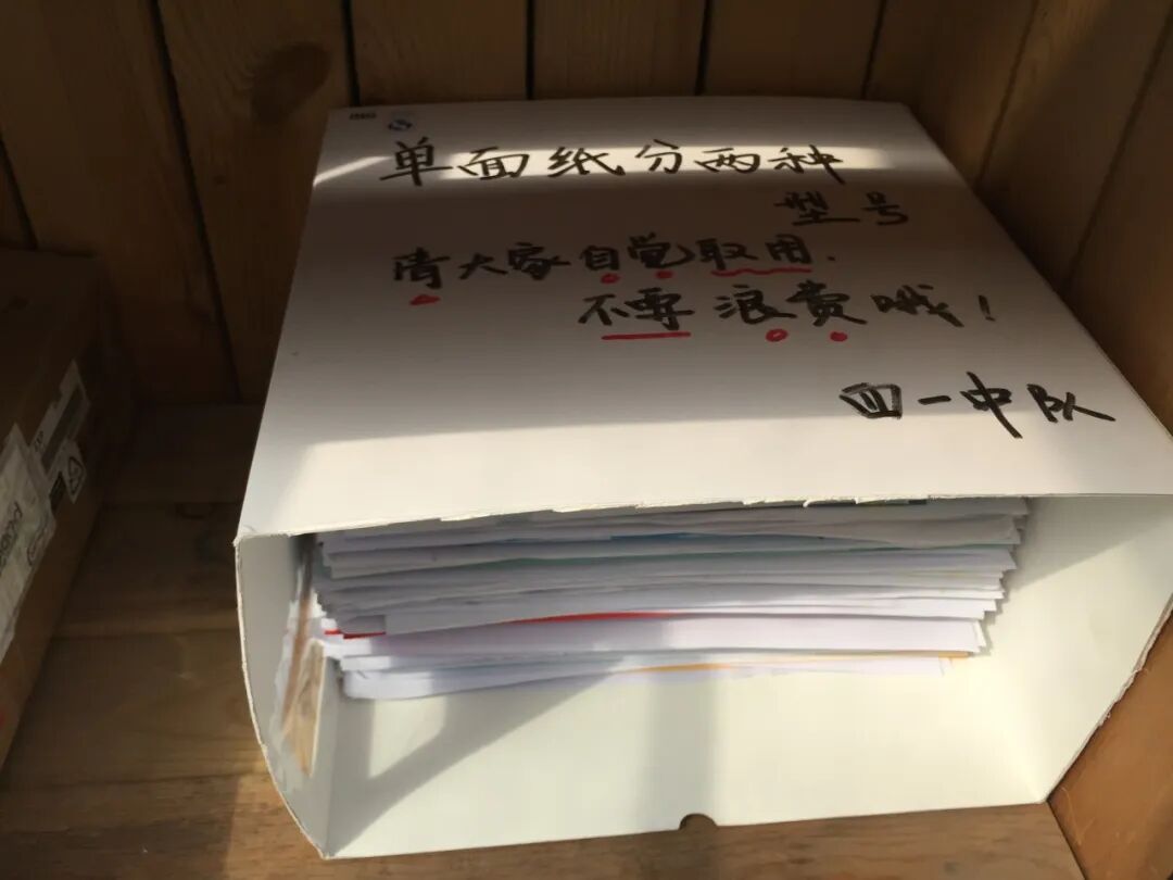 现在,我们每个班级都在教室中放置“二次纸回收箱”,将可以再次利用的单面纸回收使用。