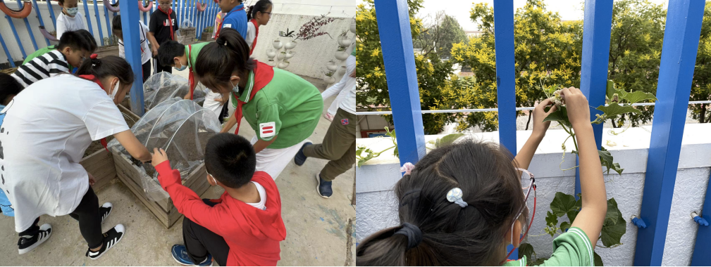 在这些丰富的活动中,孩子们的环保意识提升了,其他方面也在成长。比如在农场,孩子们发现很难种出小西瓜、小黄瓜。于是我引导他们去查资料,孩子们惊喜地发现,开的花下面有个小果子的是雌花,没有小果子的是雄花,雌花受精才能结出果实,当没有小蜜蜂授粉时,就需要人工授粉。他们将雄蕊在雌蕊上蹭一蹭,过段时间果然结出了小西瓜、小黄瓜。