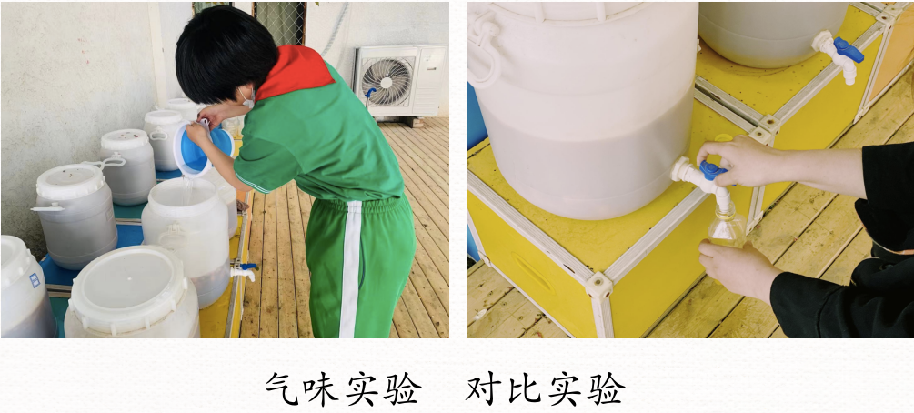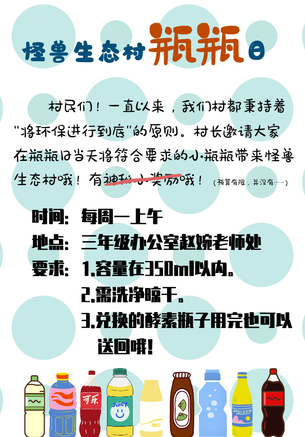 同时我们还收集各种小瓶瓶。每周五是我们固定的瓶瓶日,每个班级都会将回收到的瓶子送到生态基地汇总,装上生态村生产出的酵素和液肥。小瓶瓶一直循环使用,将作用发挥到最大。这就是重复使用的小循环。