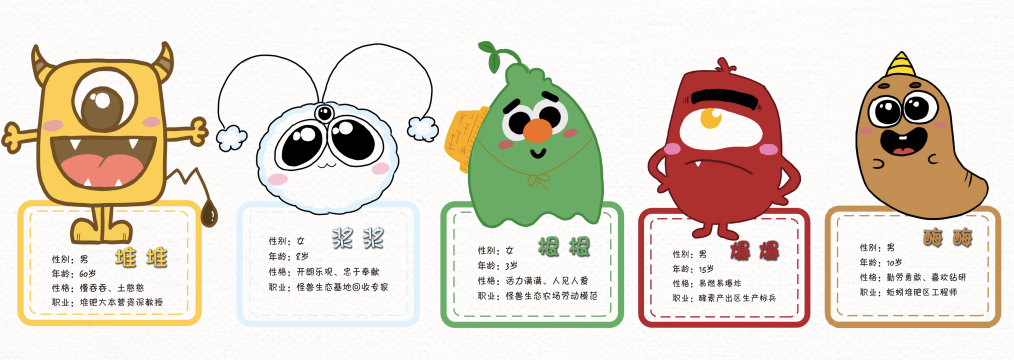 怪兽生态村成为了孩子们最喜欢的地方。我们根据不同的环保行动,设计了5只可爱的小怪兽——根根、爆爆、浆浆、酶酶和堆堆,他们各有各的性格和人物特性,分管生态村的五个区域,他们是孩子们环保路上的陪伴者,共同完成挑战。