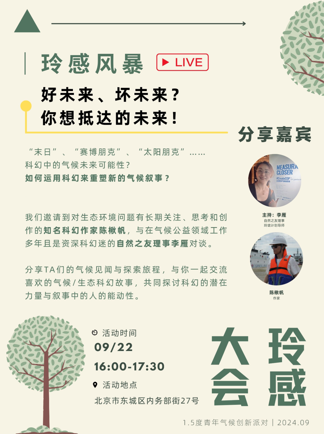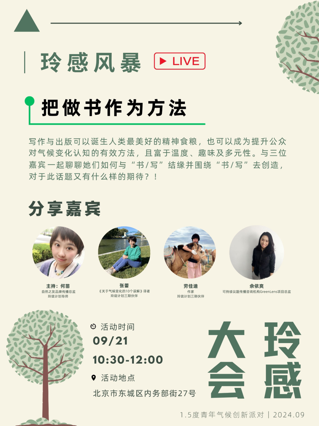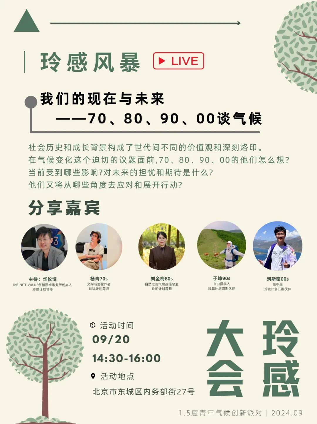 9月20-22日,欢迎你来线下以及在线上看直播的方式参与「玲感大会」——1.5度青年气候创新派对。我们在北京27院儿以及自然之友视频号等你来!