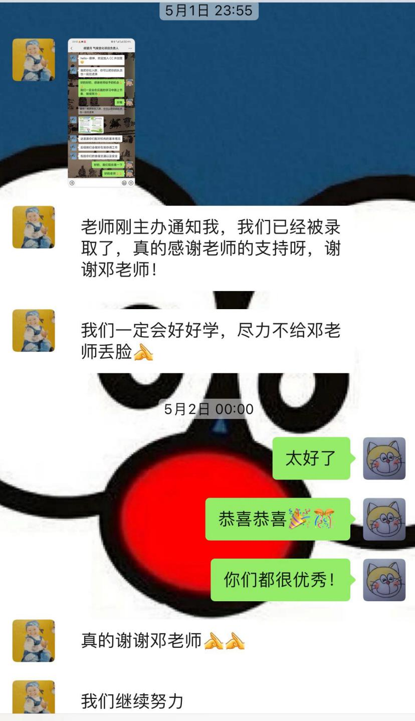 学生被录取后,向邓欣报喜、感谢,邓欣给予了他鼓励