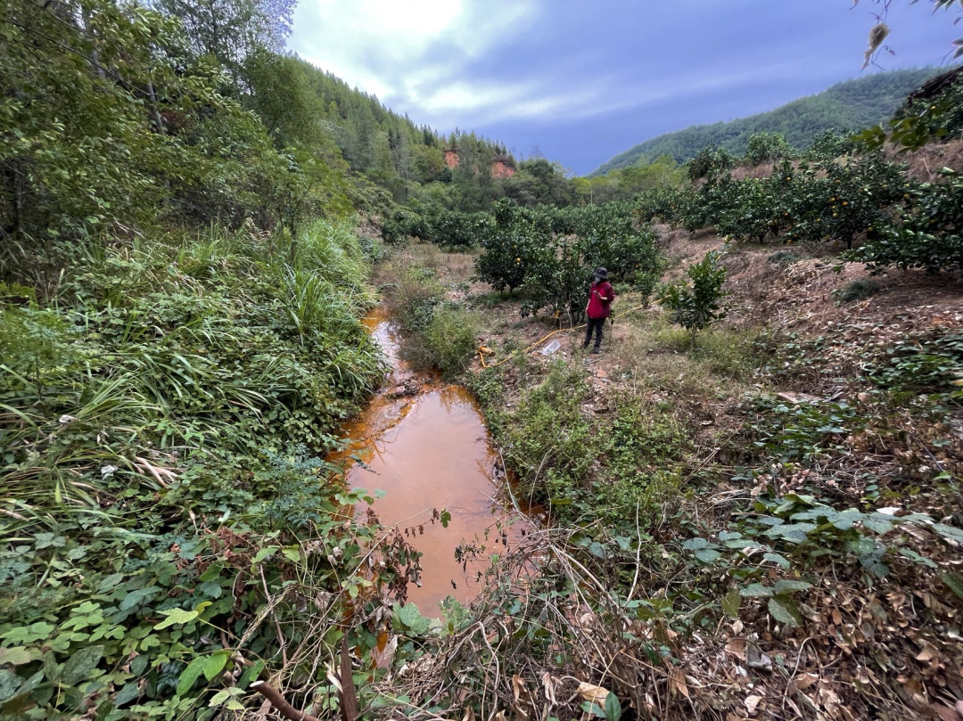 ▲2022年11月1日拍摄,内洋坑尾矿库大坝外收集池废水违法外溢至外环境,坝外小溪呈硫磺色,PH2.9呈酸性