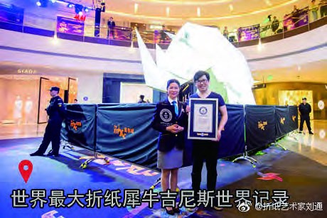 “那天其实非常非常紧张,中间失误了一次,纸犀牛没立起来。”刘通现在聊起来,还有点激动,眼睛发亮。“当时瞬间就懵了,毕竟周围那么多人看着。但我不能失败,立刻开始回忆每一个步骤,看到底哪里出了错。”第二次尝试后,刘通完成折叠,将长7.833米、高4.064米的纸犀牛立在万象城。