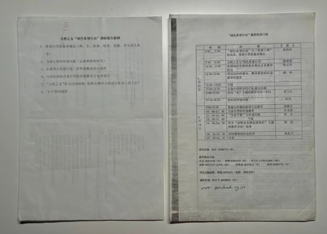 距离杨晓东在京进修的结业期越来越近,进修完成后,他将回到自己的家乡和原本的工作岗位。当时从山西去北京的交通不是很方便,资金也有限,但他不想两手空空地走。《“绿色希望行动”教师培训日程》故事往前推了一步——和当初加入自然之友会员一样,没过几天,杨晓东就报名了“绿色希望行动”教师培训,并将家人接到北京一起参加。2000年5月13日和5月14日为期两天的集训时间并不长,但是,生态平衡、栖息地保护、生物链……这些新词汇却让杨晓东彻底打开了思路,他决定将这些理念带回太行山。