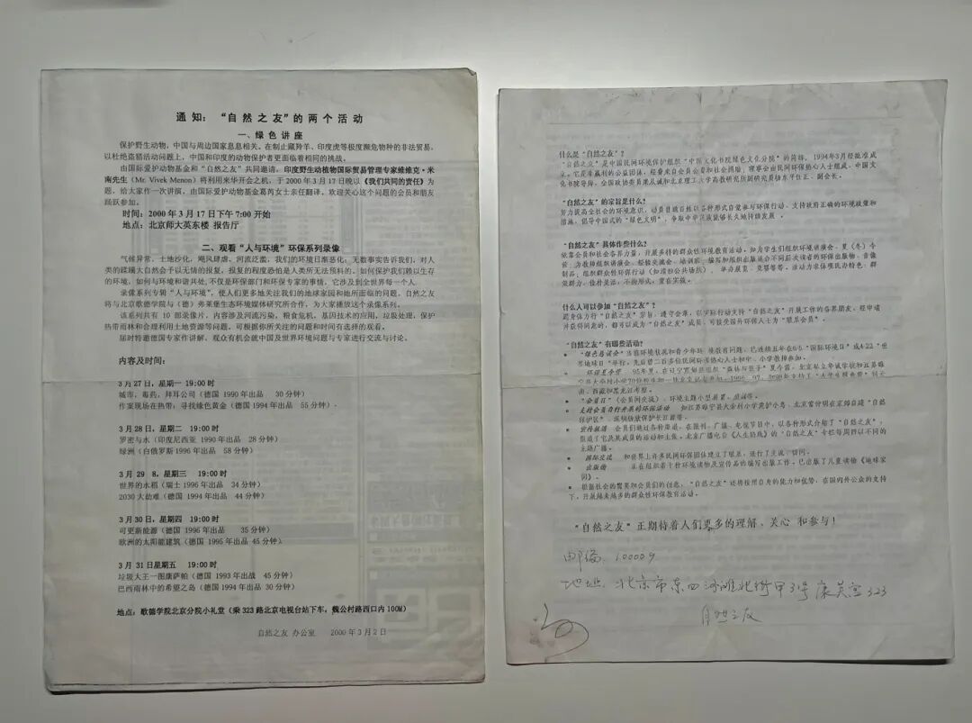 找到了组织,成为了会员,一切都在迅速、热烈地开展。2000年3月2日,一份名叫《通知“自然之友”的两个活动》的文件,记录着千禧年春天的集会。