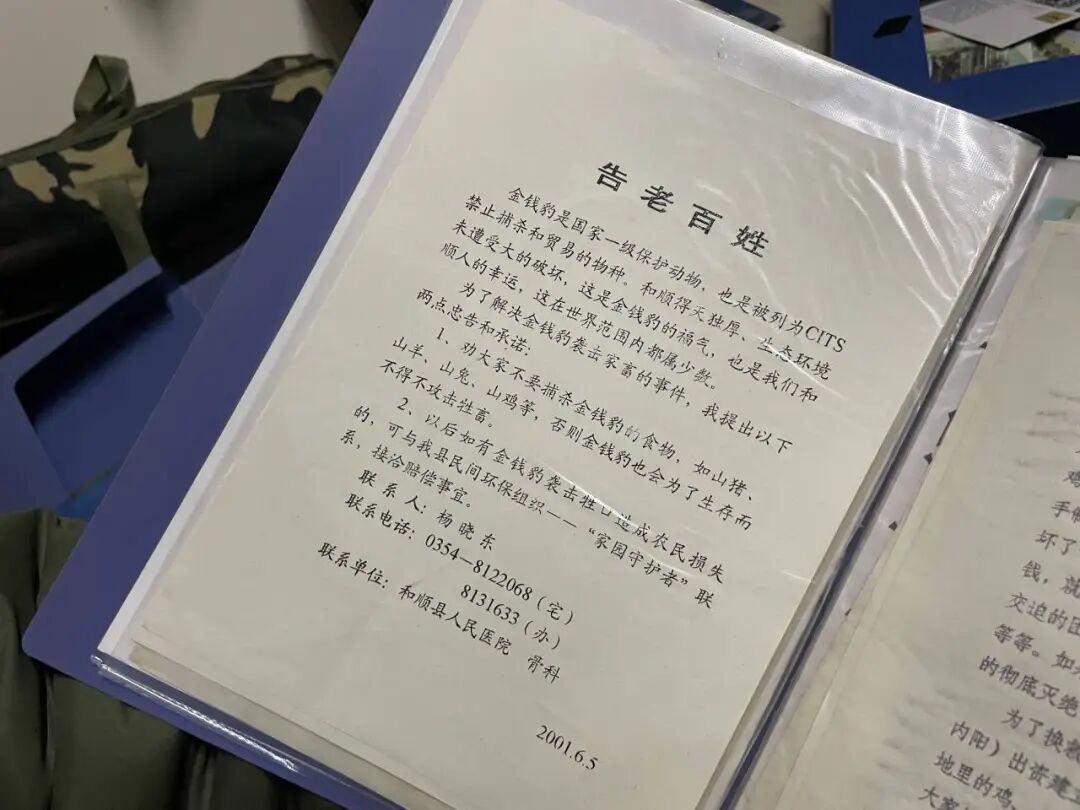 2015年,杨晓东在县人民医院除了负责日常的管理工作,还需要完成县里的扶贫任务,扶贫地点是华北豹在和顺县域内的重点栖息地——马坊乡。有了猫盟的社会资金和科学保护力量,再加上县里对口扶贫政策保证,当年猫盟和县医院共拿出四万元的人兽冲突补偿基金在马坊做试点,用来补偿农户被野猪拱地、豹吃牛的经济损失;2016年,推动了县政府把生态补偿纳入常规财政预算;2022年,山西省开展生态补偿的商业保险模式试点工作,和顺成为了八个试点县之一,补偿的力度和范围都大幅提高。