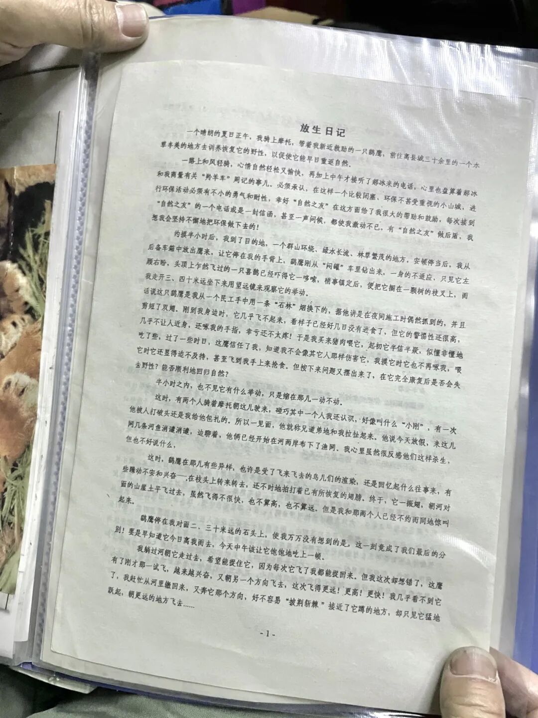 “一个晴朗的夏日正午,我骑上摩托,带着我新近救助的一只鹞鹰,前往离县城三十余里的一个水草丰美的地方去恢复它的野性,以促使它能早日重返自然。……一路上和风轻骑,心情自然轻松又愉快,再加上中午才接听了郝冰(时任自然之友羚羊车项目负责人)来的电话,心里也盘算着郝冰和我商量有关羚羊车周记的事儿。必须承认,在这样一个比较闭塞、环保不甚受重视的小山城,进行环保活动必须有不小的勇气和耐性,幸好自然之友在这方面给了我很大的帮助和鼓励,每次接到自然之友的一个电话或是一封信函,甚至一声问候,都使我激动不已……”